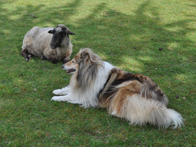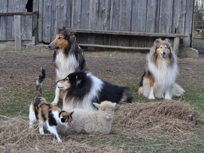 bilde pie šķūņa. Sienā pie jēriņa apgūlies