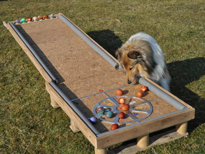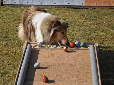 Olu ripināšanas spēle ir ļoti izdevusies. Šogad izmēģināsim arī jauno olu boulinga spēli, kurā tās vajadzēs gāzt, ripinot tenisa bumbiņas.